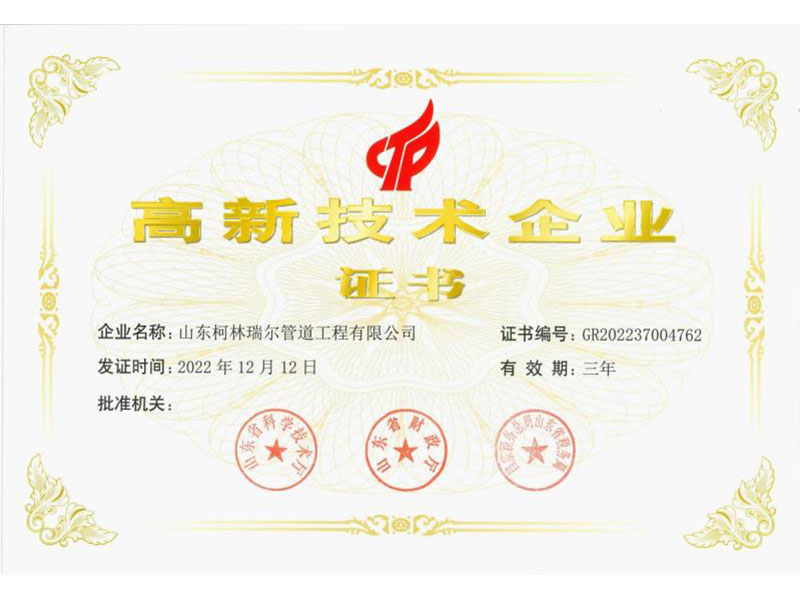 山東柯林瑞爾管道工程有限公司是國家級高新技術(shù)企業(yè),水資源節(jié)約與保護產(chǎn)業(yè)創(chuàng)新聯(lián)盟理事單位。公司與中國石油大學(xué)(華東)、北京化工大學(xué)等多家知名院校和國家實驗室建立了長期密切的合作關(guān)系。公司被評為“山東省專利明星企業(yè)”,“質(zhì)量信得過單位”,“企業(yè)信用AAA級單位”,山東省“專精特新”企業(yè)。